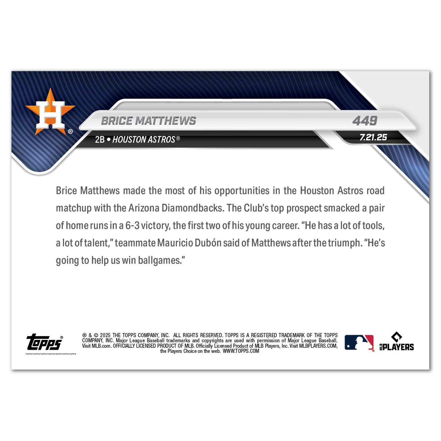 Brice Matthews - 2025 MLB Topps NOW® - Card 449