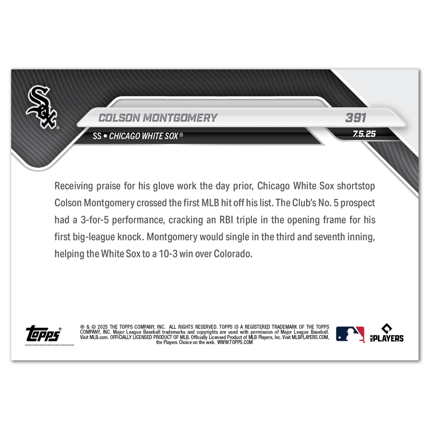 Colson Montgomery - 2025 MLB Topps NOW® - Card 391