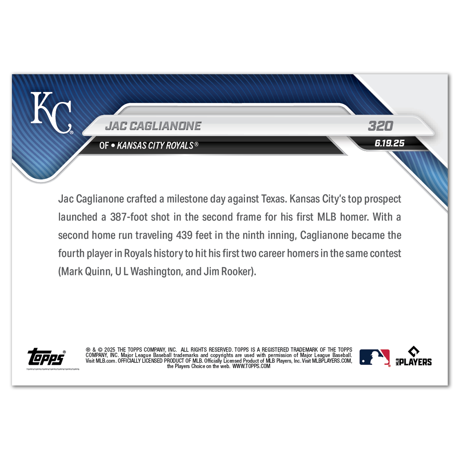 Jac Caglianone - 2025 MLB Topps NOW® - Card 320 - LOOK FOR RELICS