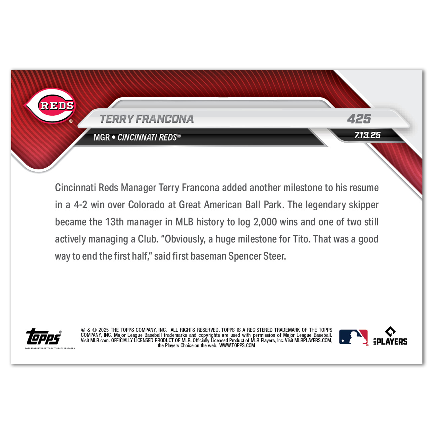 Terry Francona - 2025 MLB Topps NOW® - Card 425 - LOOK FOR AUTOS